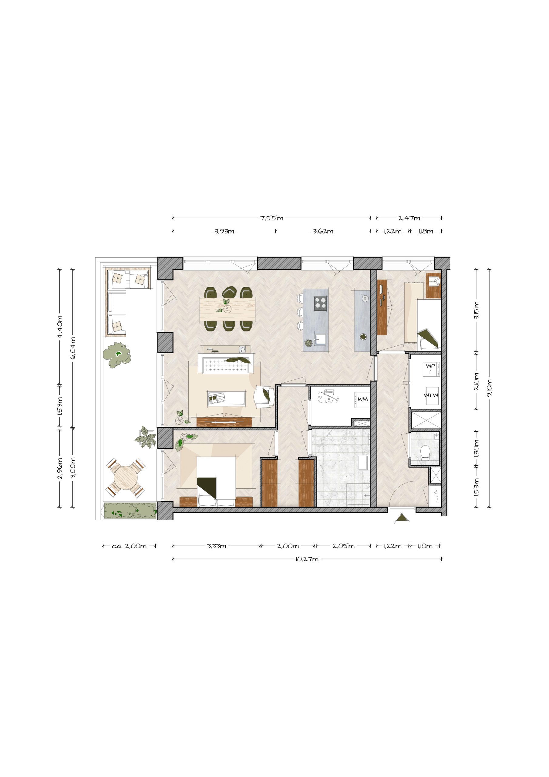 Sales floor plans—from compact two-room apartments to generous penthouses—make the smart layouts and spacious outdoor areas immediately clear.